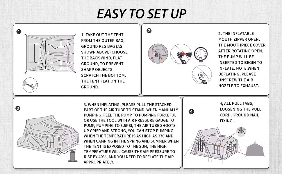 Our Oxford fabric inflatable tents are renowned for theirremarkable durability and robust air pillar support. Thesetents offer reliable shelter from the rain on stormy days andeffective shade from the sun on sunny days. Additionally, thedouble-sided ventilation design enhances air circulation,allowing you to fully enjoy the fresh, natural air.